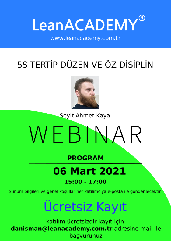 Yalın üretim temek tekniklerinden olan 5S ile webinarlarımız devam ediyor 5S webinarı -- * *LeanACADEMY* www.leanacademy.com.tr info@leanacademy.com.tr *