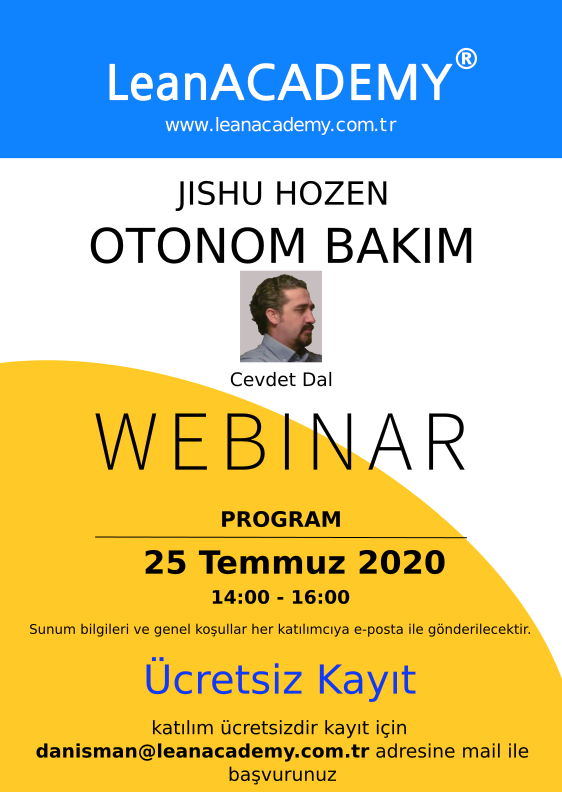 Yalın üretim uygulamalarının temel uygulamalarından OTONOM BAKIM (JISHU HOZEN) webinarı 25.07.2020 de. Bu haftaki ERP YOL HARİTASI eğitimine kayıt olmayı da unutmayın. -- *Cevdet Dal *LeanACADEMY* www.leanacademy.com.tr T. +90 533 256 2019 cevdet.dal@leanacademy.com.tr *