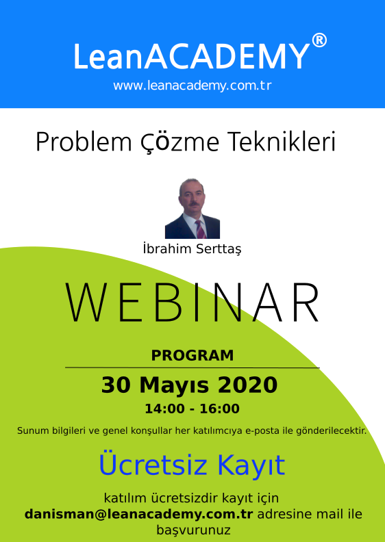 Problem çözme teknikleri webinarına davetlisiniz. 30 mayıs 2020 14:00 - 16:00 arası, katılım ücretsizdir. Kayıt olmak için danisman@leanacademy.com.tr adresine e-posta ile başvurunuz. -- * *LeanACADEMY* www.leanacademy.com.tr info@leanacademy.com.tr *